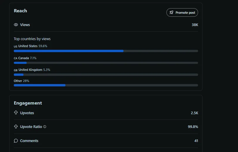 At The Quiet Marketer, I've delivered 389K views, 6.8K upvotes, and a 96% upvote ratio across campaigns. Not every post goes viral, but the trend over time is what matters.